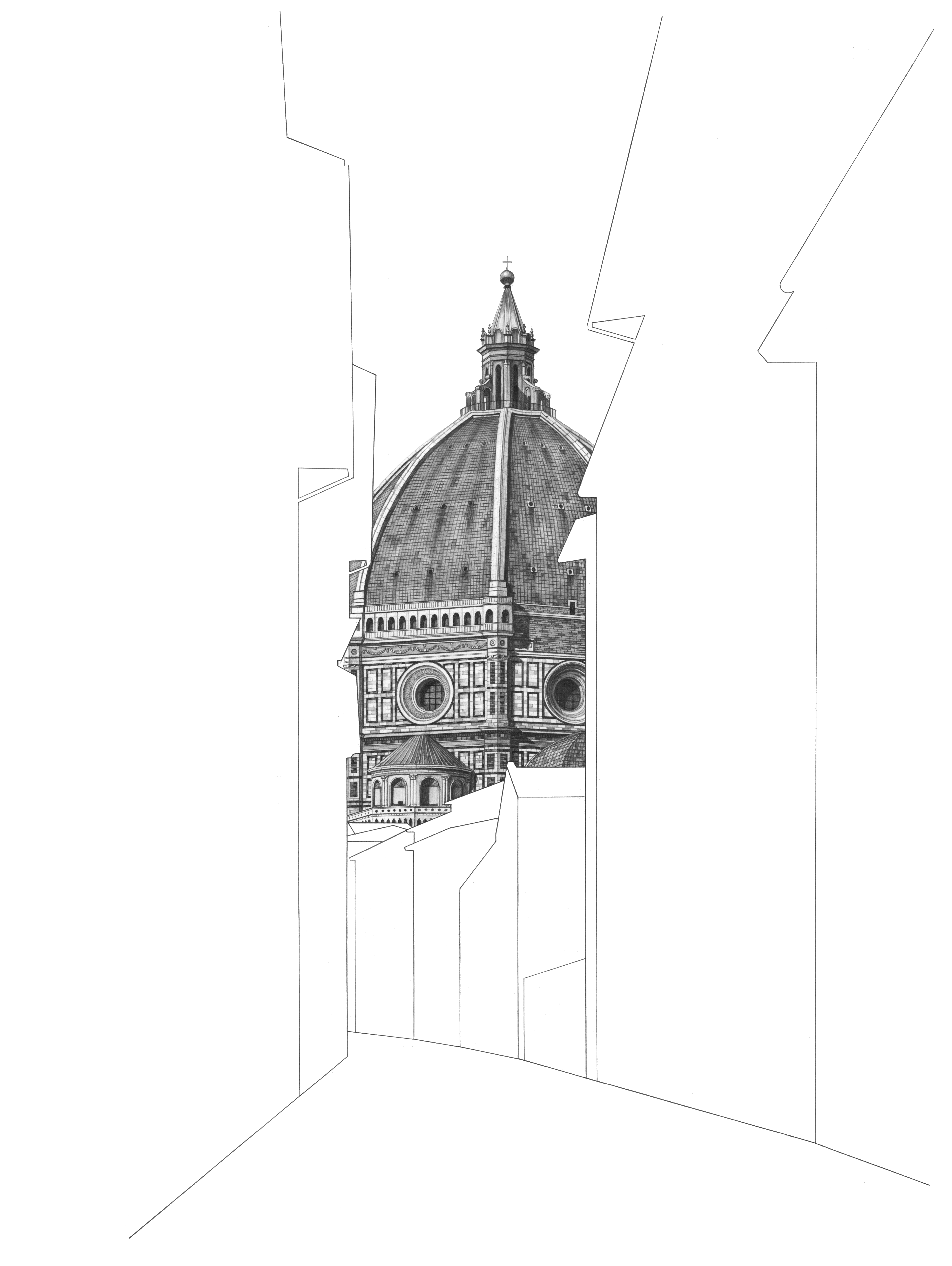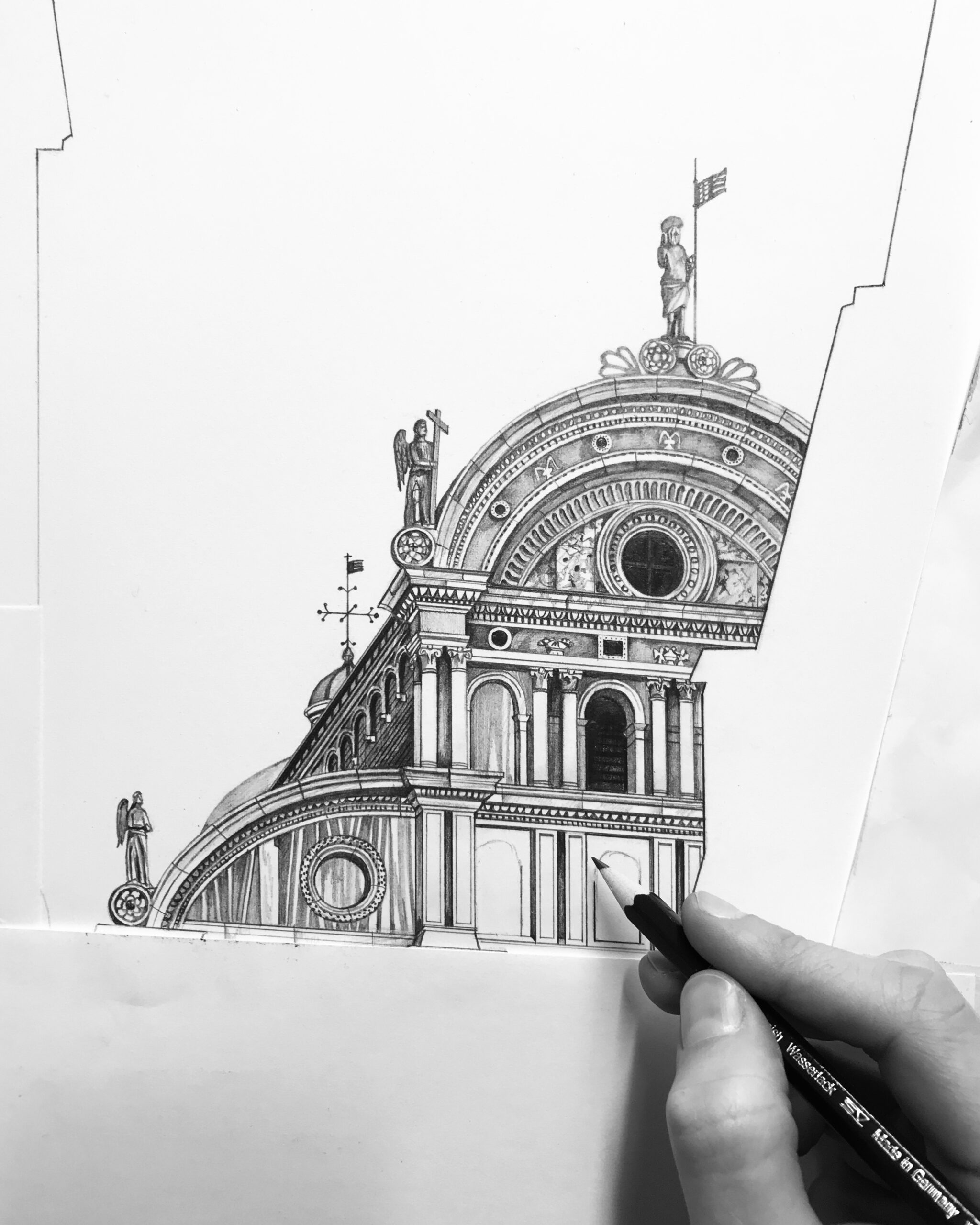 “I wanted to capture a view in the city of what it’s like to stumble across a glimpse of the famous cathedral. You can just see a section of the building but I hope it makes the viewer intrigued to see more of it.” – Minty Sainsbury, artist