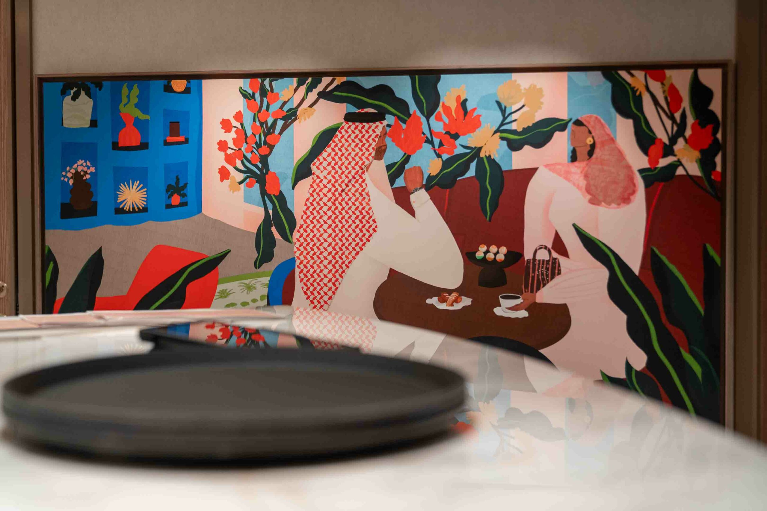 Working closely with SMC Art’s concept team, Ethar Balkhair developed a bespoke design that acts as a visual narrative for the café’s atmosphere. The artwork brings the space to life through exaggerated characters, glimpses of natural elements seen through imagined windows, and cultural patterns that echo the region’s heritage. A thoughtfully chosen colour palette ties the artwork seamlessly to the interior design, creating a cohesive experience that reflects both the café’s identity and the essence of Saudi Arabia. Throughout the process, the artist collaborated with the team to weave in details unique to the client’s brand, ensuring the final composition felt personal and meaningful.