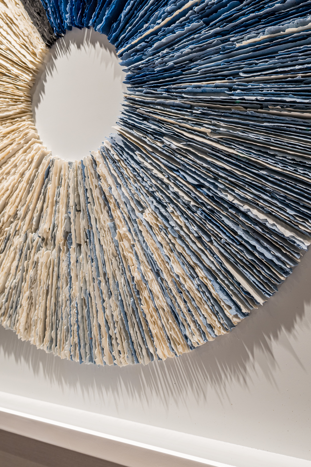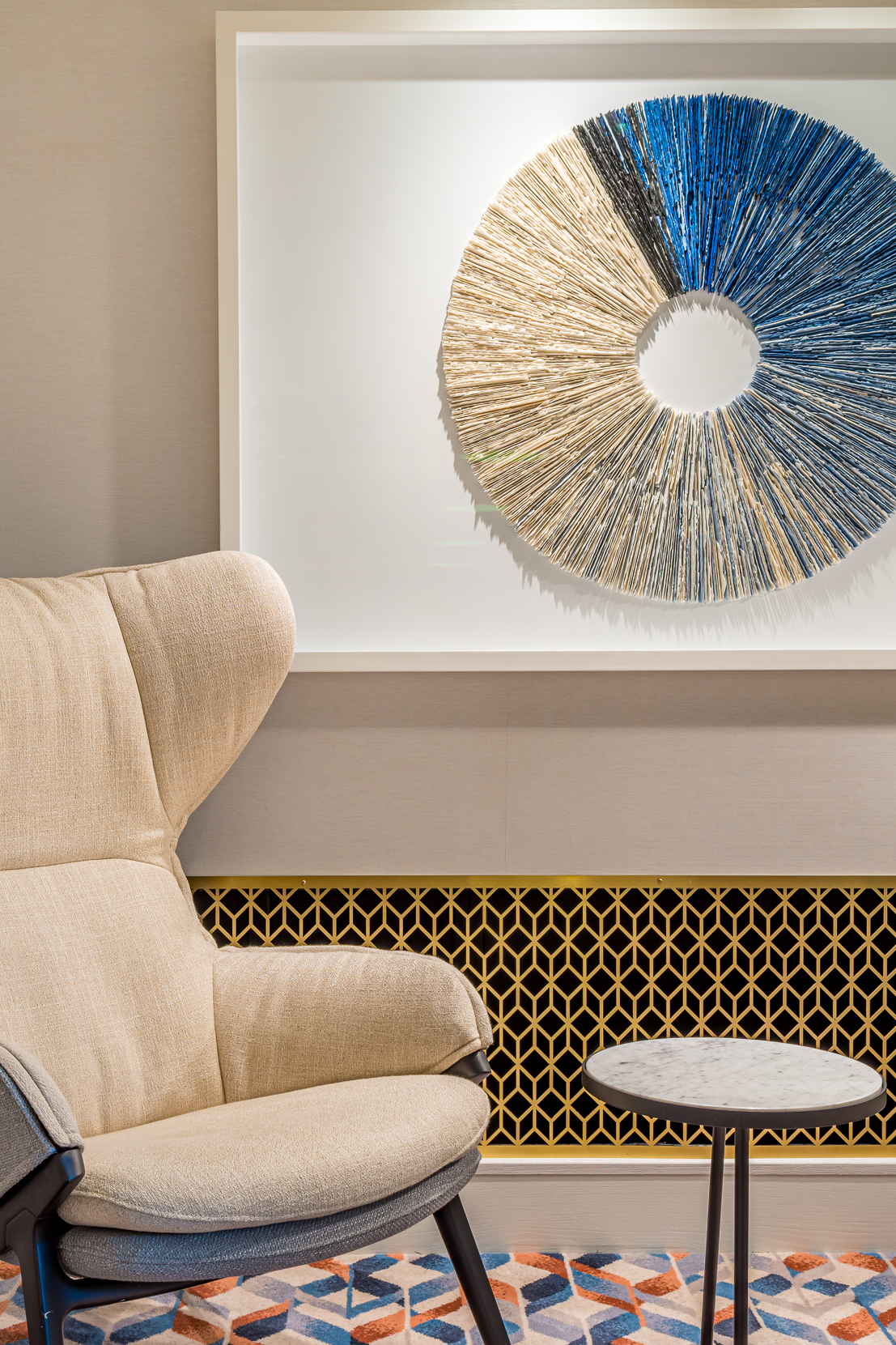 This installation is crafted from shards of stained porcelain, with their fragile edges symbolizing the erosion of the British coastline. The artist’s work thoughtfully incorporates the client’s branding colours to connect the artwork seamlessly with the space.