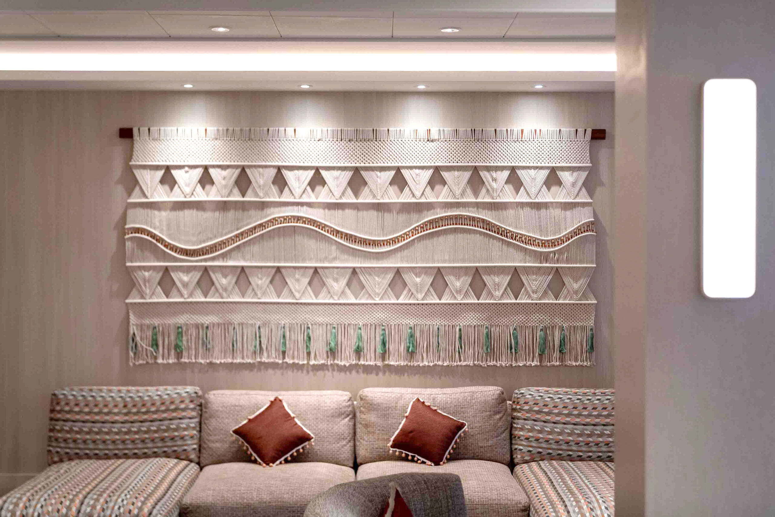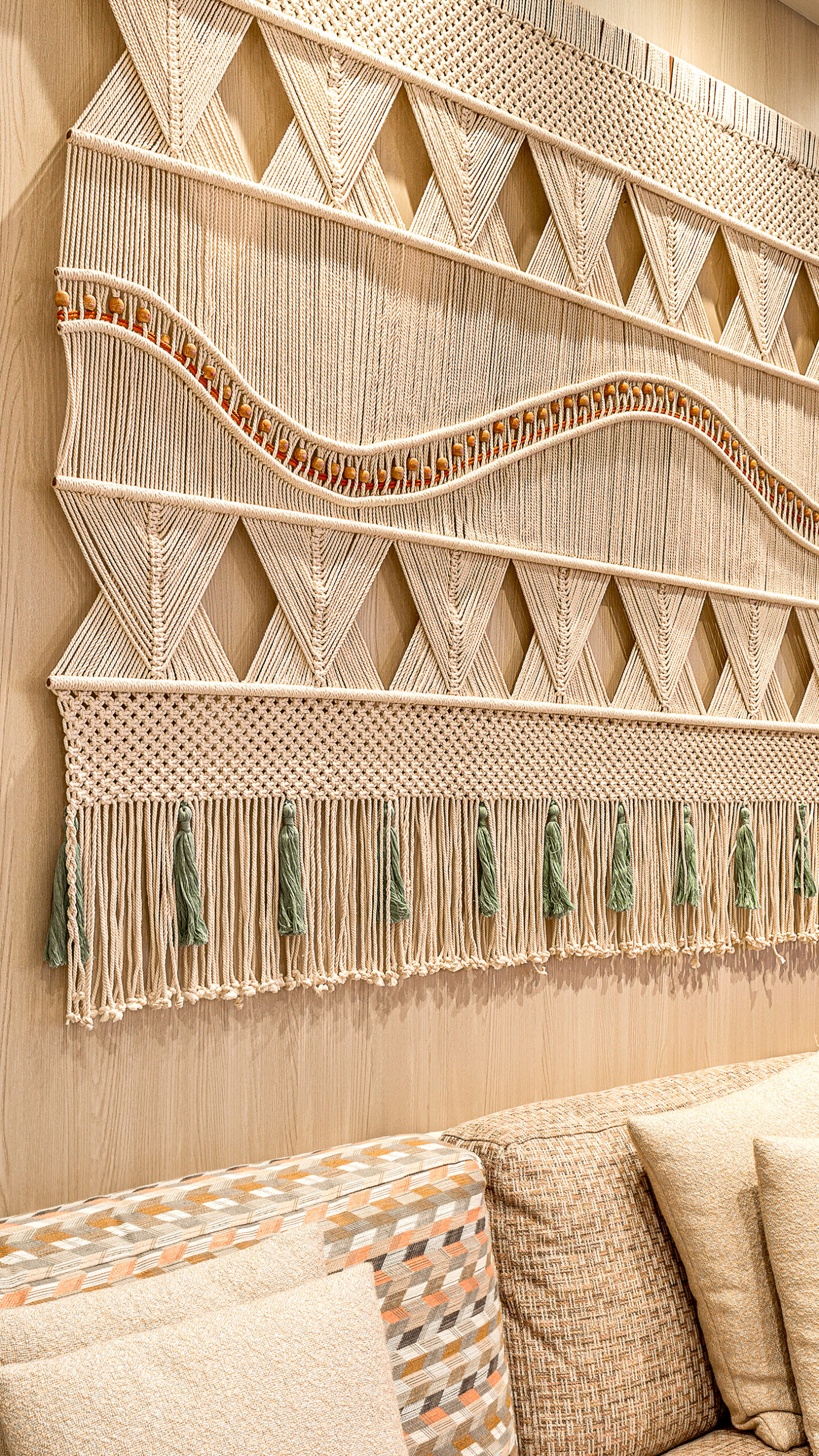 The 3-metre tapestry Desert Waves captures the fluid, organic beauty of the Red Sea, celebrating the rhythmic elegance of macramé craftsmanship.