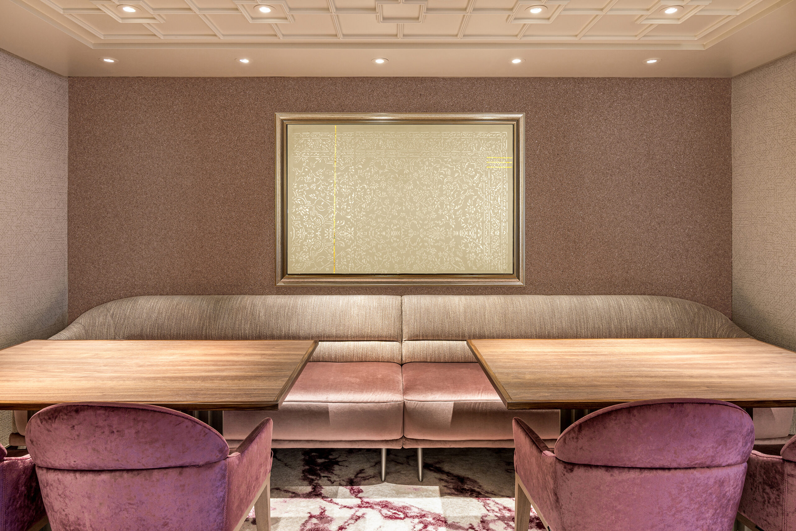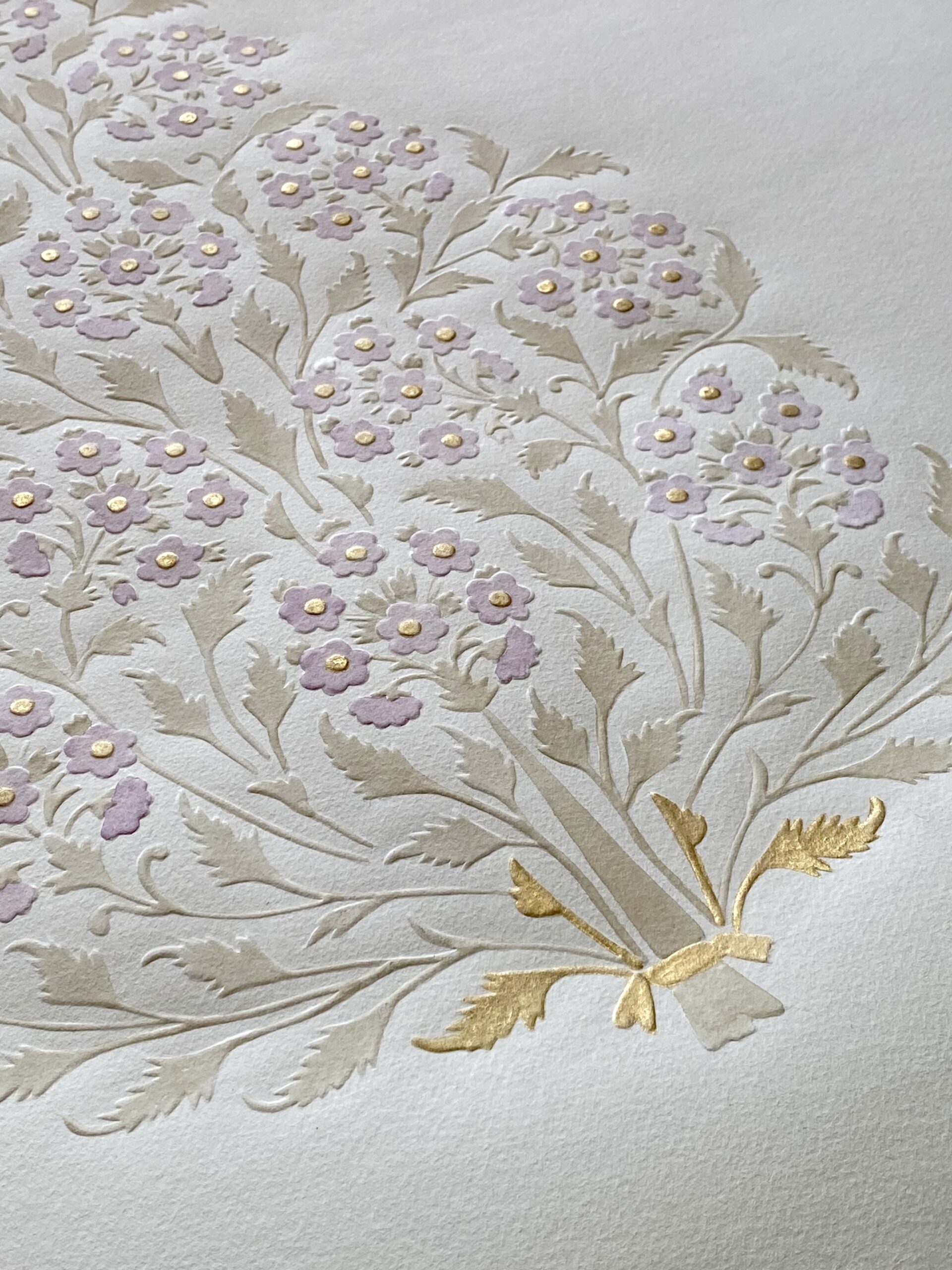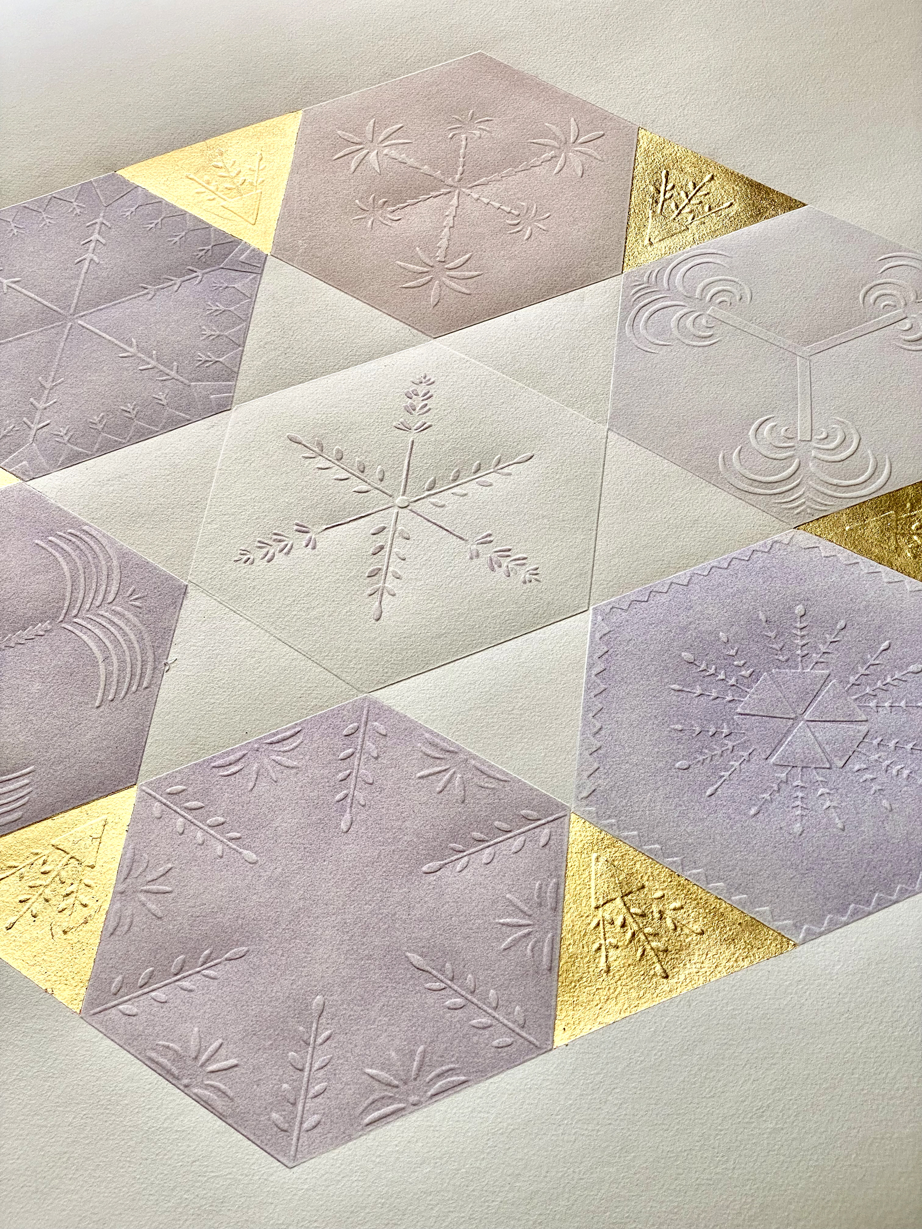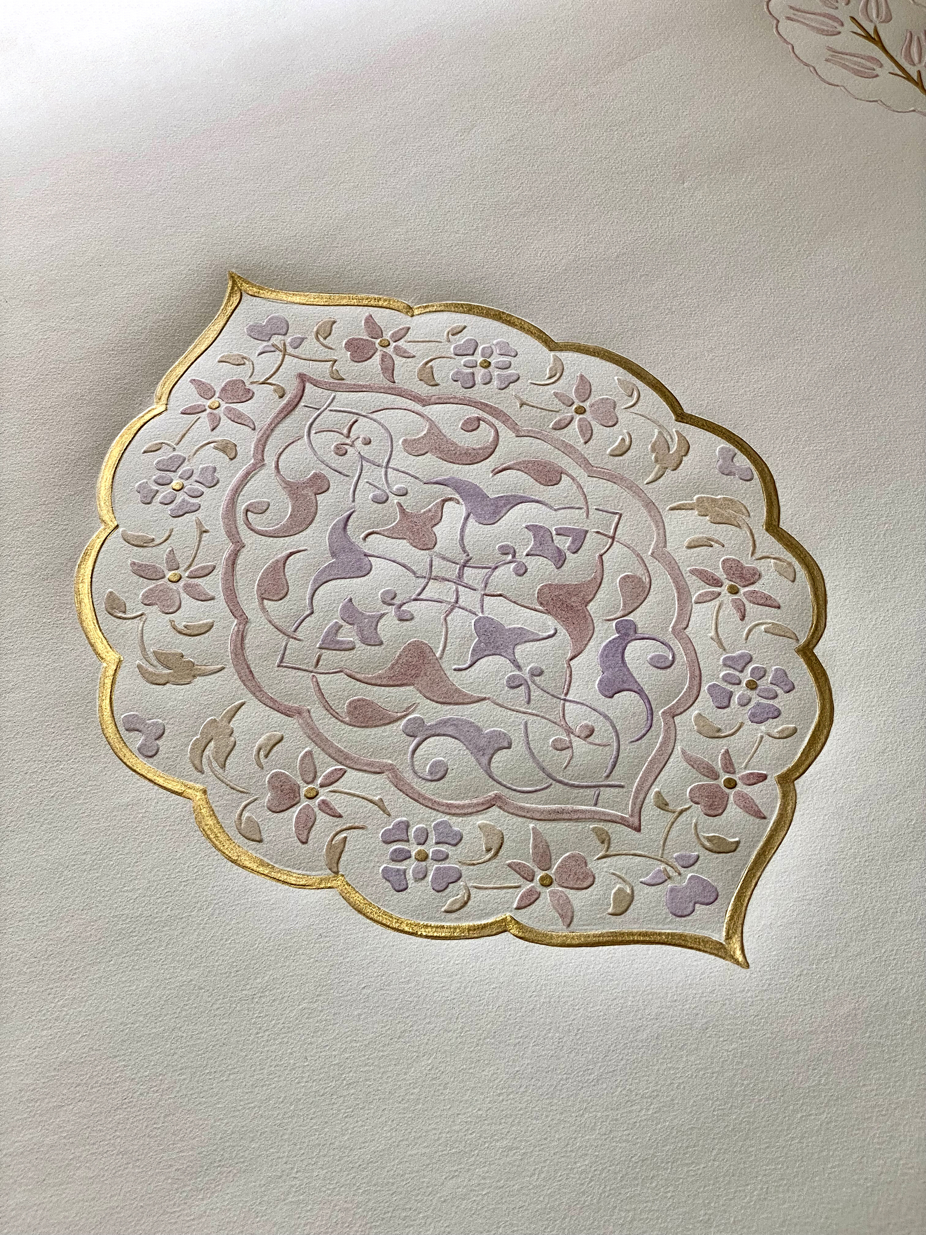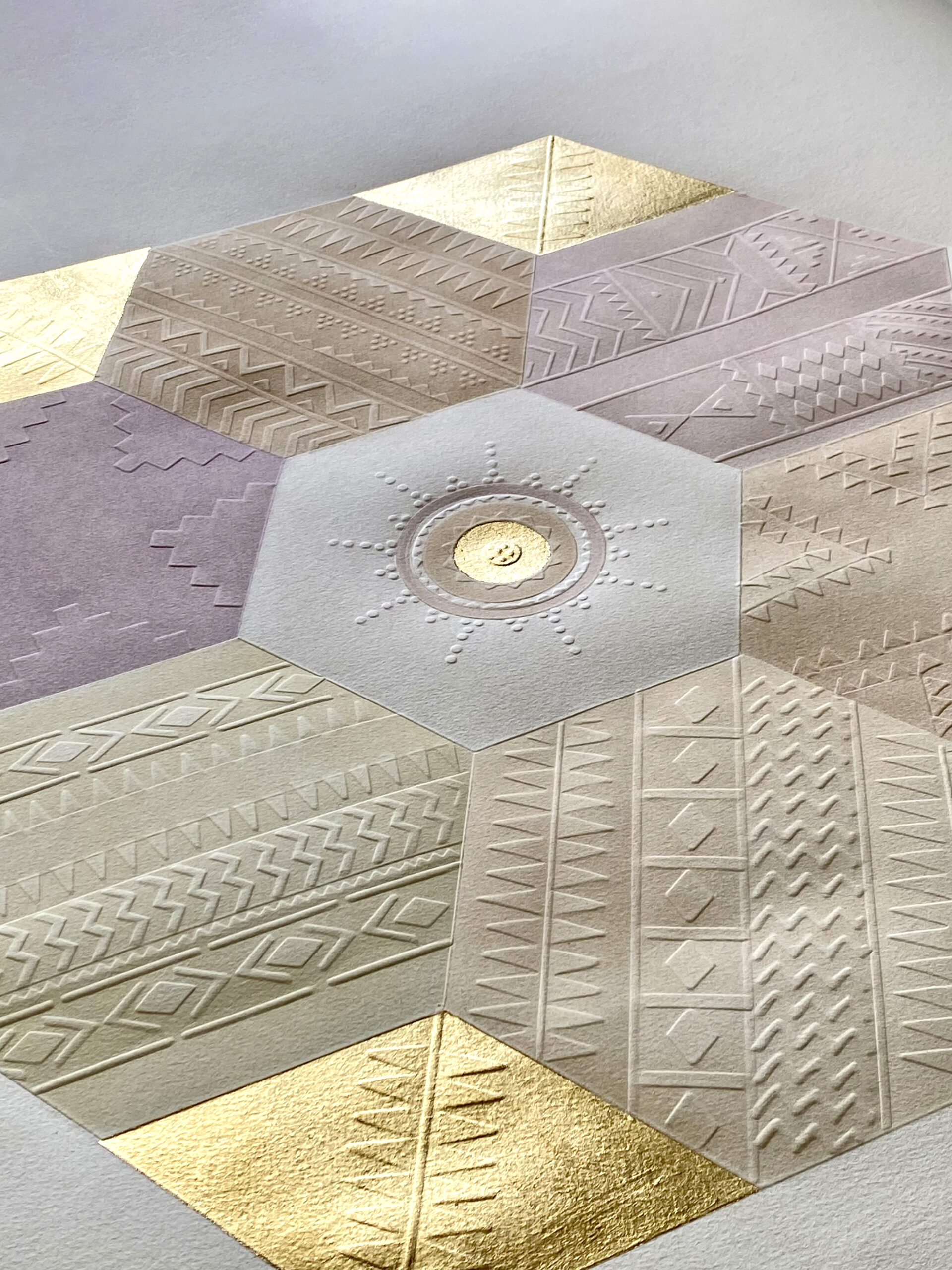 The artist Raeda Ashour’s signature hand-embossing technique comes to life through delicate layers of soft pastels, watercolours, and touches of gold leaf. Her work draws from the shifting tones of desert sands, the graceful forms of palm trees and traditional adobe architecture - especially the ornamental motifs found in engravings and wall drawings of old homes.