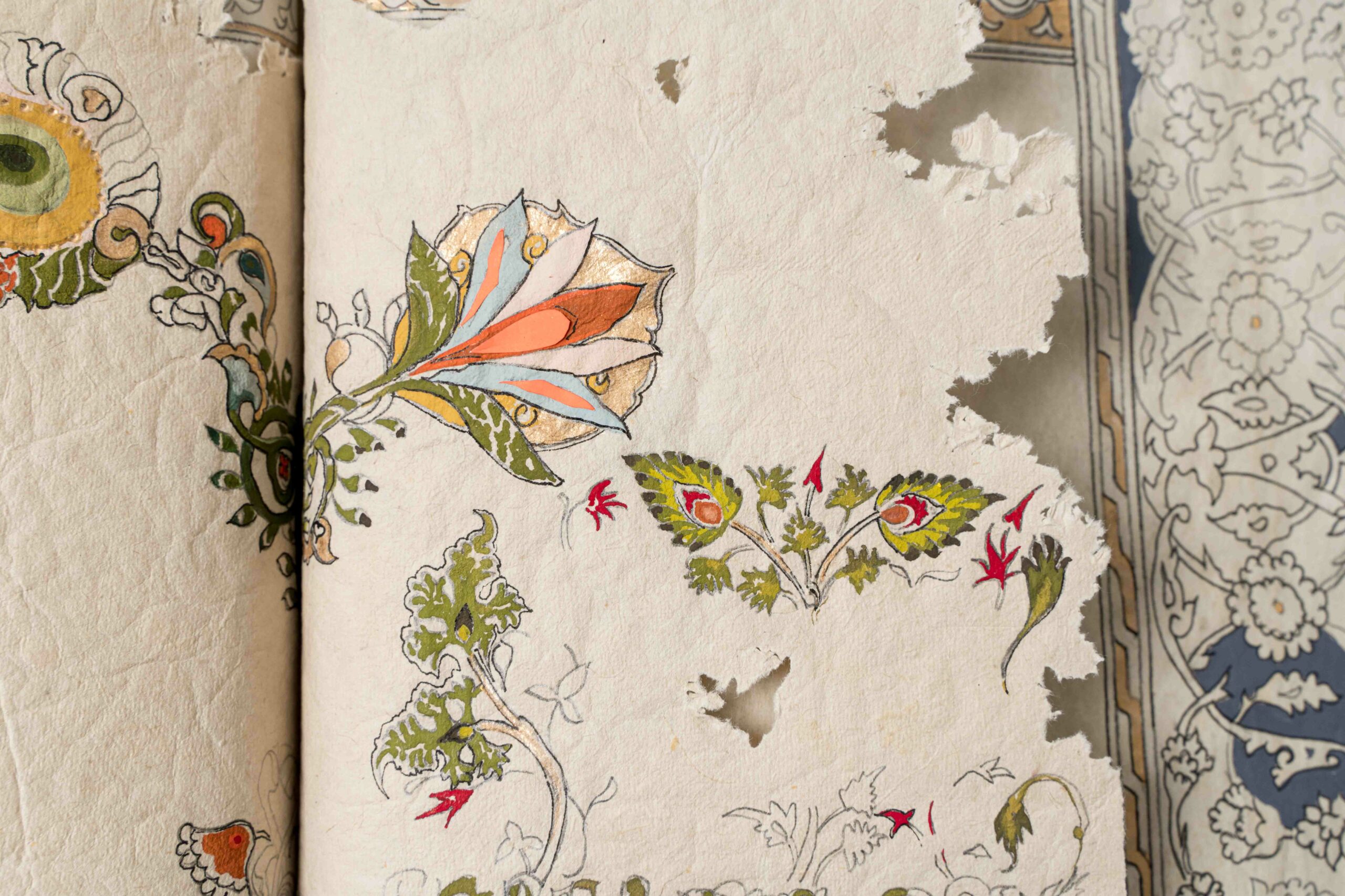 Theworks, created using Panama paper layers with cotton paper gouache colour and gold leaf embellishments - reflect the intricate stages of bookmaking, weaving in details like delicate embroidery stitched with golden threads and subtle marks of aging that hint at history, use, and memory.