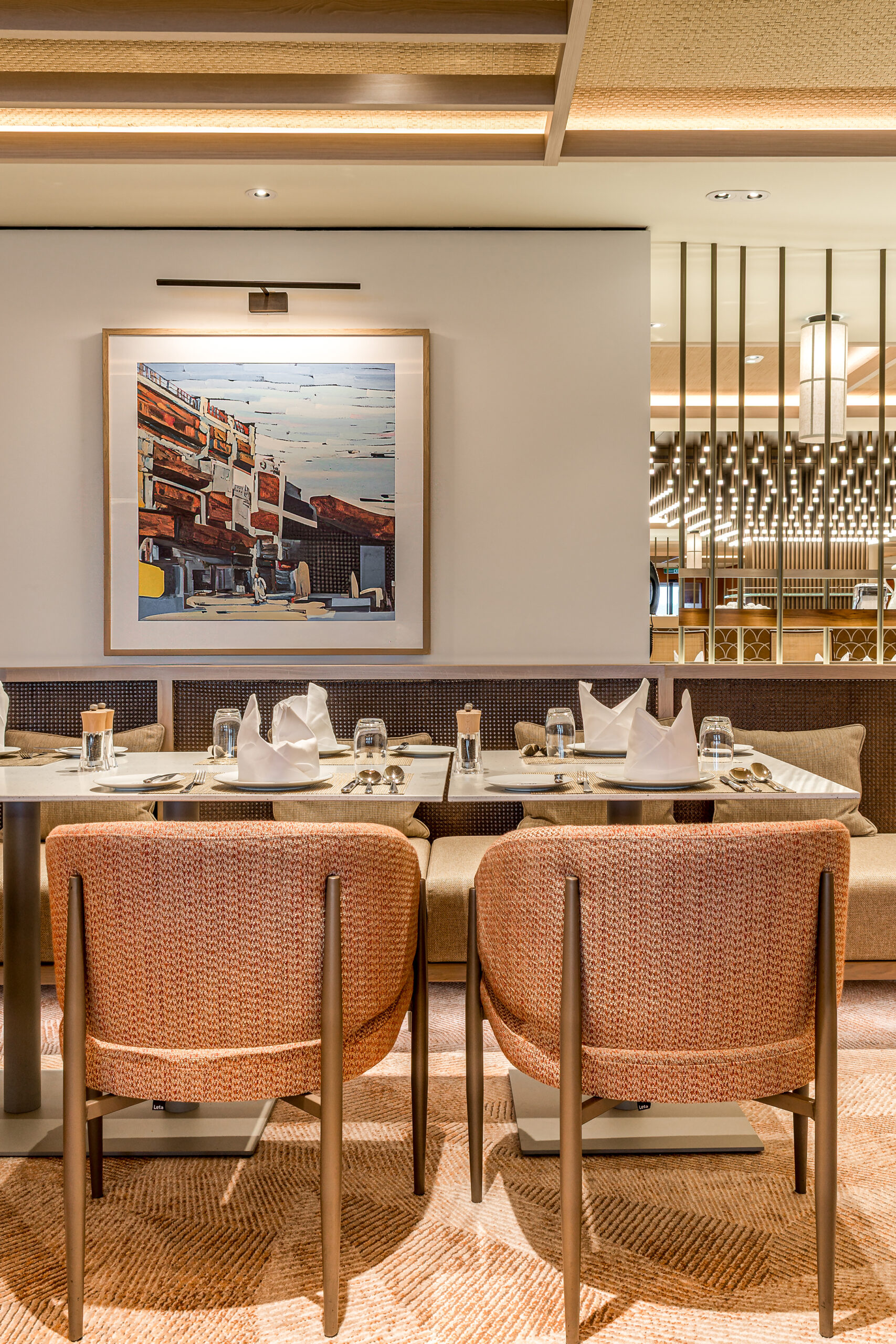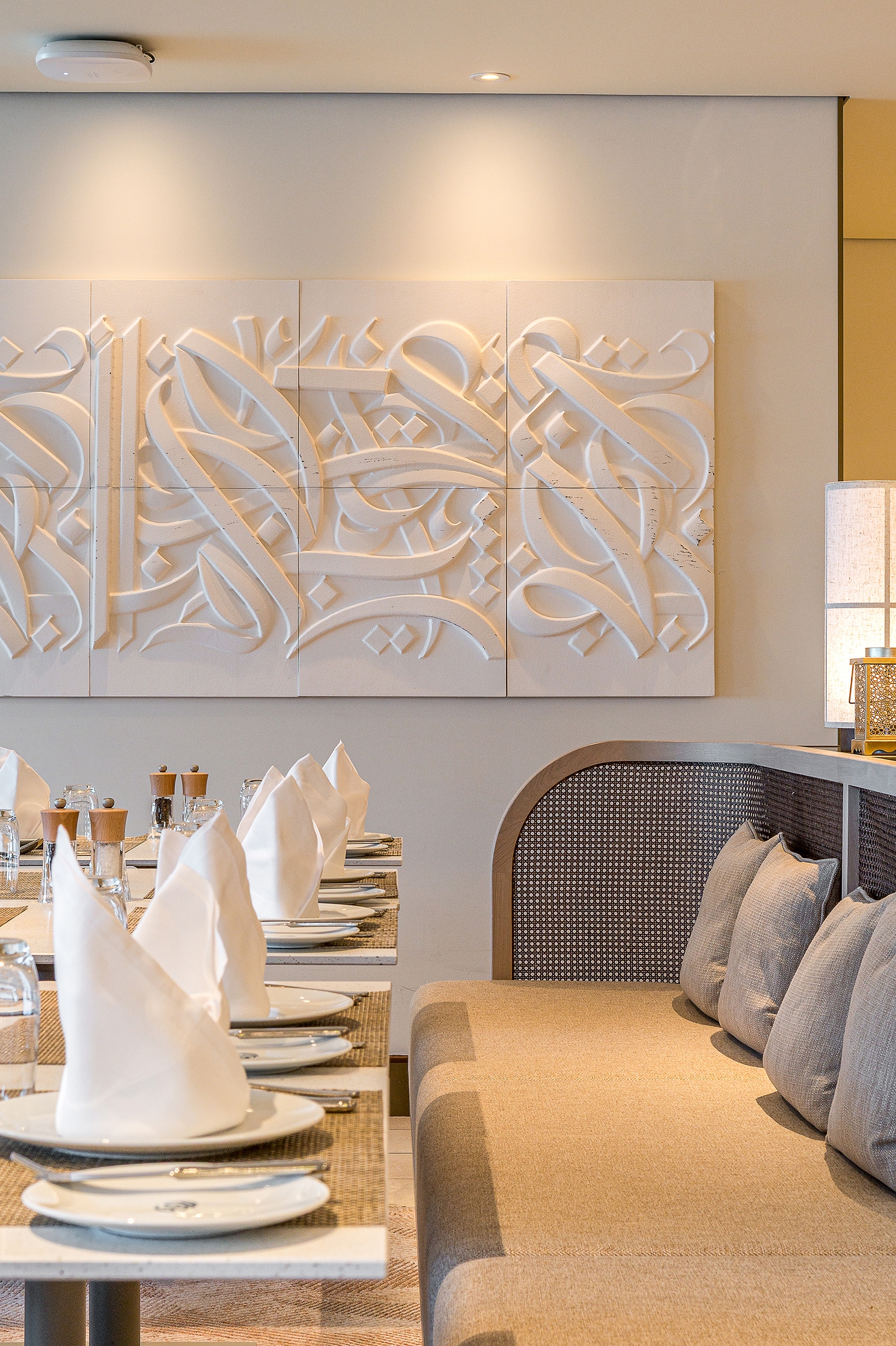 | The expansive Main Dining Hall onboard Aroya features large-scale hand carved wooden reliefs depicting abstracted calligraphy designs by the Saudi Arabian street artist, Mohammed Khaber.