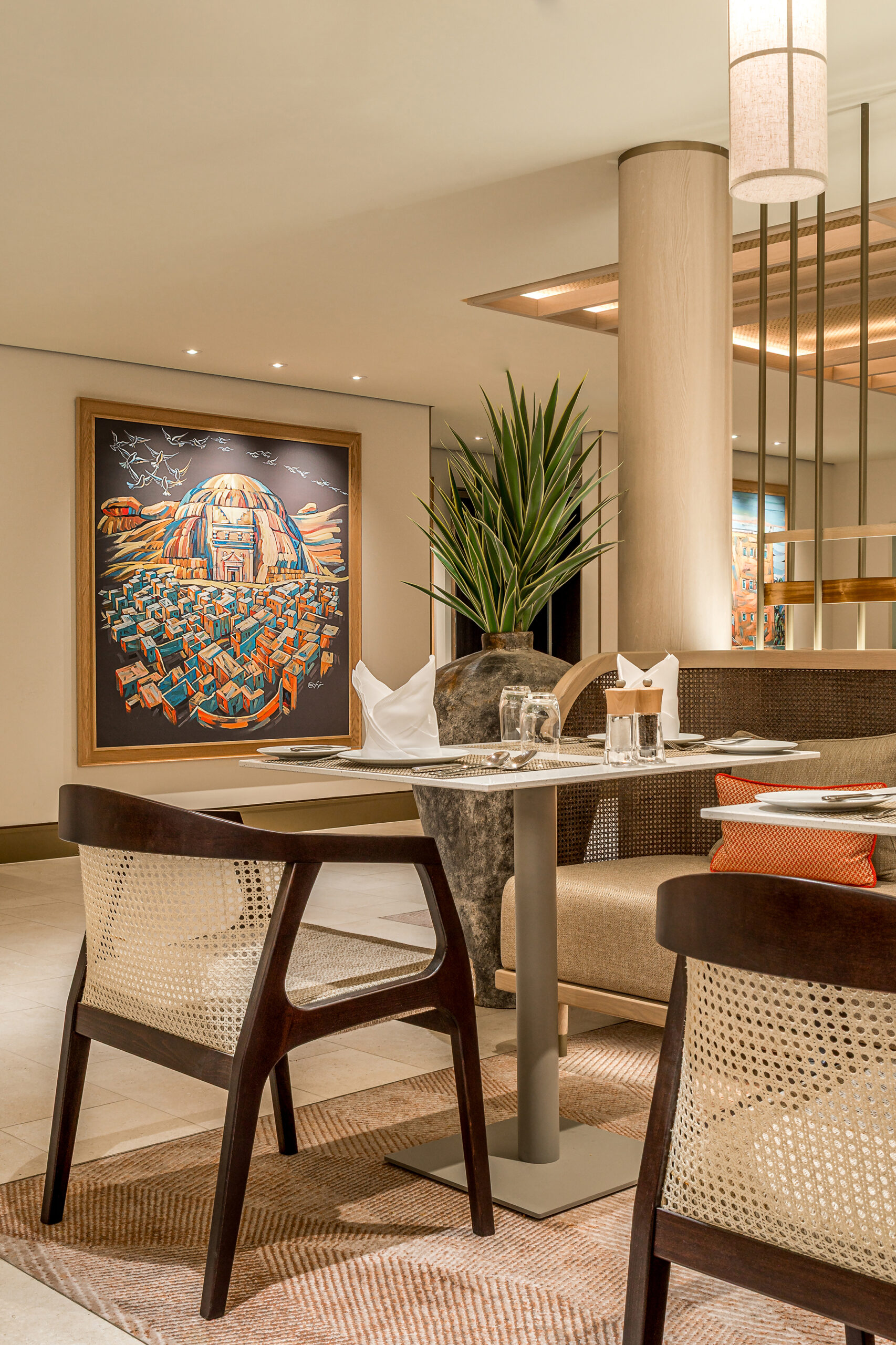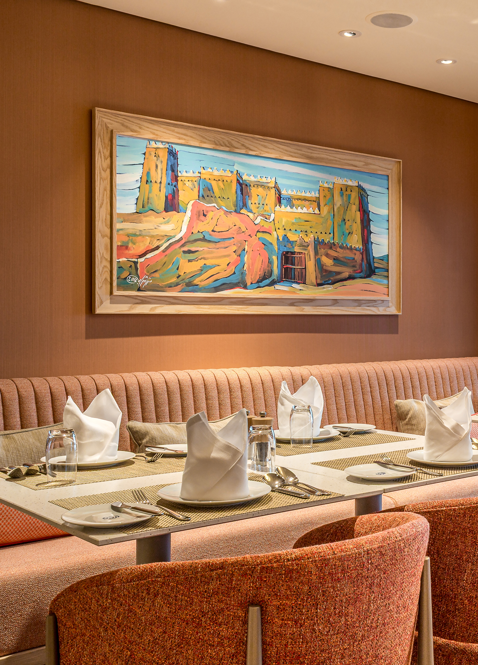 Alongside these are a series of 33 bespoke paintings featuring differing and contrasting architecture throughout Saudi Arabia by renowned artist Monzer Charaby. Charaby’s work celebrates the unique and authentic character of historical Dariya, Asir, and Jeddah, showcasing the charm of their neighbourhoods and buildings adorned with intricate wooden Rawashen. |